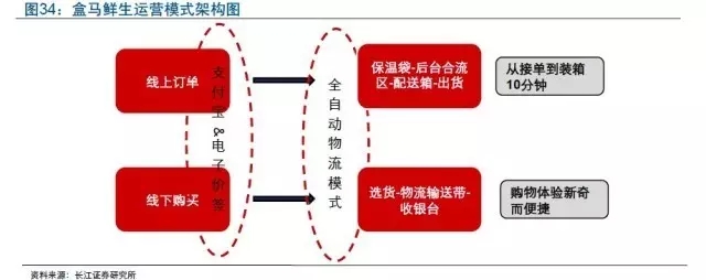 盒马鲜生的运营特点可以概括为:(1)支付宝快捷支付:支付宝作为唯一支付平台,统一现金流;汉朔电子标签打通线上线下信息,实现价位同步;(2)餐厅入驻提升体验:“餐厅”纳入卖场,强化线下体验;五公里范围,半小时送达;(3)自动分拣并配送满足便利需求:300平米合流区,前端体验到后库装箱,都由物流带全自动传送,APP接单到装箱只需要10分钟。