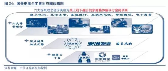 国美电器2016年已完成整体上市,并提出从“电子消费类零售商”转变为“线上线下融合的家庭整体解决方案提供商”,通过打造“娱乐休闲、生活美食、家装设计、互联网电视、智能物联、电子商务”六大场景形成前端平台,通过物流和全球化采购平台形成供应链张力为中台,通过服务云平台打造后台,进而形成前、中、后台强链接,为消费者提供整体解决方案,形成吃喝玩乐平台型大生态。