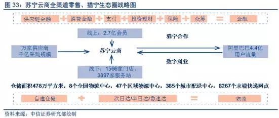 事实上,国内最成熟的传统家电连锁巨头苏宁和国美,近来的战略转型正可以视为全渠道整合和重构的典型。苏宁云商引入阿里282亿元股权投资,以及合资成立“猫宁电商”之后,将可以充分结合阿里大数据(4.4亿用户)和苏宁供应链C2B能力,提升公司差异化产品比例以及小b端和c端的客户服务能力。