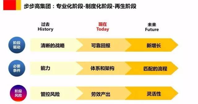 在企业生命周期组织阶段模型中,步步高集团整体上处于制度化阶段,阶段驱动力是可靠的回报,必要条件是体系和架构,阶段风险是劳效产出。未来三到五年,步步高集团将由制度化阶段进入再生阶段,阶段驱动力是新增长,必要条件是匹配的流程,阶段风险是灵活性。