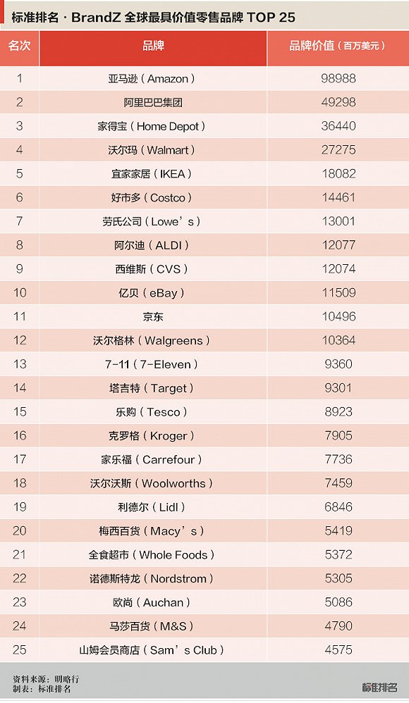 全球最大广告传播集团WPP旗下子公司明略行(Millward Brown)日前发布2016/2017全球最具价值零售品牌报告,美国电商巨头亚马逊名列榜首,成为全球最具价值品牌,其品牌价值较上一年度增加59%至989.88亿美元,阿里巴巴和全球领先的家居建材用品零售商家得宝紧随其后,分列第二、第三位,其中,阿里巴巴品牌价值较上一年度下降26%至492.98亿美元,约为亚马逊价值之一半,家得宝增加32%至364.40亿美元。