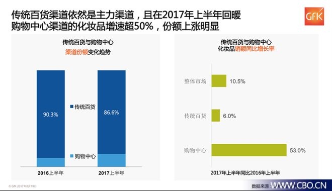 监测范围覆盖51个城市百货及购物中心渠道的GfK(捷孚凯市场咨询)给出的报告显示,化妆品类在百货渠道的发展势头良好。根据GfK的监测报告,2017年1-6月化妆品类同比增长11.3%,高于社会消费品零售总额增速;其中,传统百货渠道仍是化妆品主力渠道,且在2017年上半年回暖;购物中心渠道的化妆品增速超过50%,份额明显上涨。