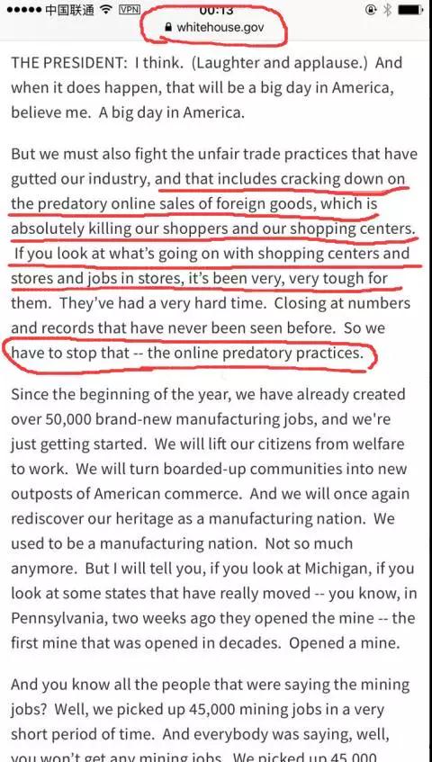 话说,后来特朗普又发推特说亚马逊少交了很多网络税,搞得全世界人都嘲笑他是法盲,哪儿来的网络税呢?实际上他要说的应该是亚马逊的卖家没有履行为政府代收消费税这事,可能是特朗普当时比较激动,脱口而出,这份演讲内容现在还挂在白宫的网站上,如图: