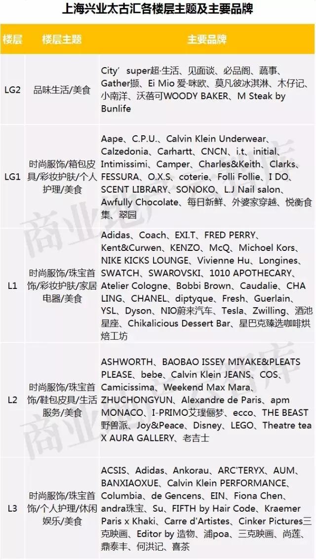 La Mer、Jo Malone、雪花秀、YSL等彩妆品牌店,精品超市 City Super、台湾瑜伽+动感单车馆Space Cycle,国内首家星巴克烘焙工坊、Let’s Taipei、Let’s Burger & Lobster、G Café、上海总会、Bar Constellation酒池星座,及Lululemon、KENZO、PUMA、Zwilling、网红茶饮喜茶等。