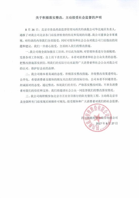 8月27日下午3时,海底捞官网发布《关于积极落实整改,主动接受社会监督的声明》,表示对北京食药监局的约谈内容全部接受;同时将媒体和社会公众指出的问题和建议,全部纳入整改措施。