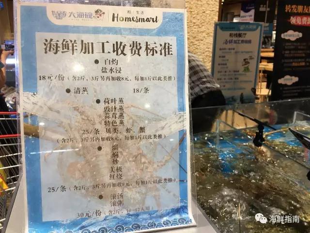 现场购买的海鲜还可以在商场现场加工,图为加工费用详情