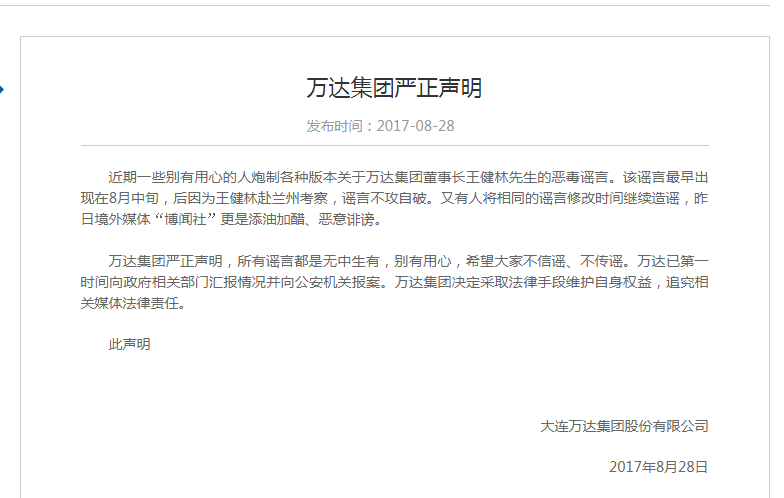 凤凰财经讯今日早间,万达官网发布声明称,近期一些别有用心的人炮制各种版本关于万达集团董事长王健林先生的恶毒谣言。该谣言最早出现在8月中旬,后因为王健林赴兰州考察,谣言不攻自破。又有人将相同的谣言修改时间继续造谣,昨日境外媒体“博闻社”更是添油加醋、恶意诽谤。