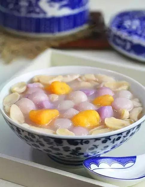 5、锅中水烧开,将糯米球、各种薯球放入,煮至浮起后捞到花生汤中,调入红糖拌匀即可。