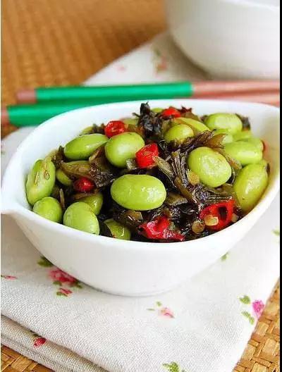 【原料】:毛豆200克、雪菜1袋、小米椒2根、姜末
