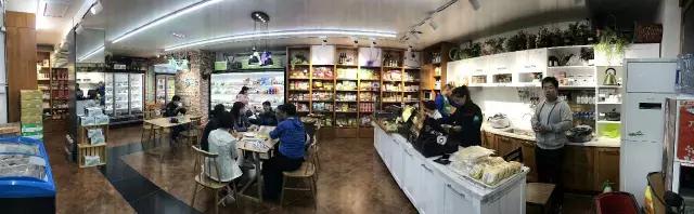 到达生鲜云厨的时候,错过了消费高峰时间,购物的顾客不多,小编正好可以仔细的观察下这间100平米的便利店。刚进到店里,小编就看到了中间精致的餐桌,高档的橱柜,雅致的摆放,精心准备的水果,以及桌子中间充满生气的鲜花,无一不体现着店内的情调。