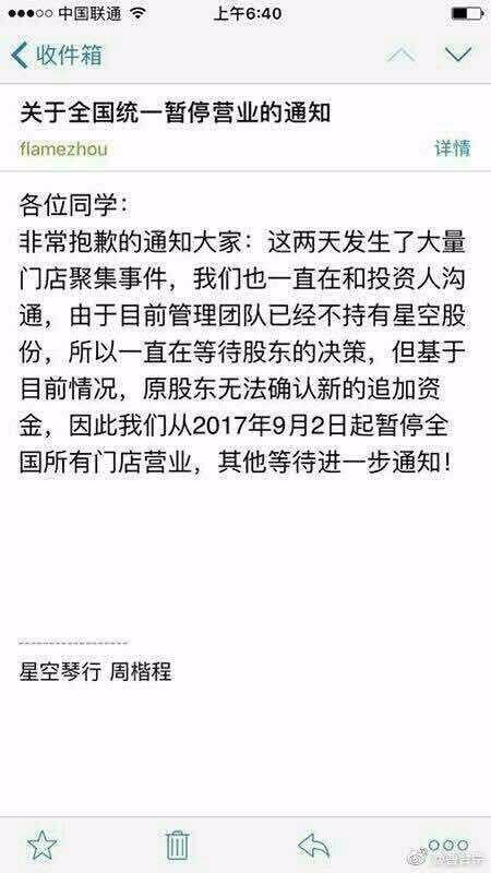 据星空琴行CEO周楷程发给公司员工的一封内部邮件显示,目前管理团队已经不持有星空股份,所以一直在等待股东的决策,但基于目前情况,原股东无法确认新的追加资金,因此从2017年9月2日起暂停全国所有门店营业。