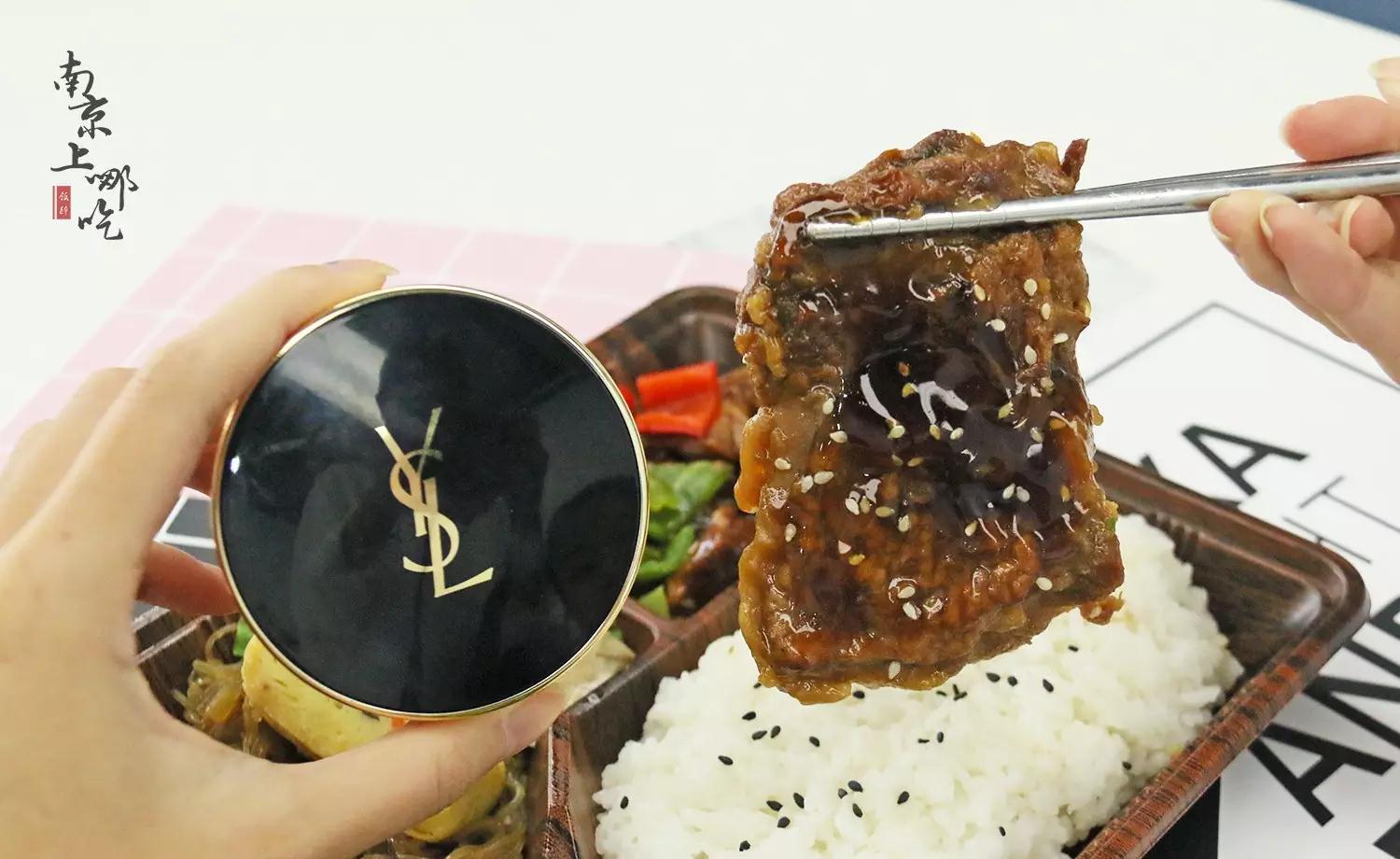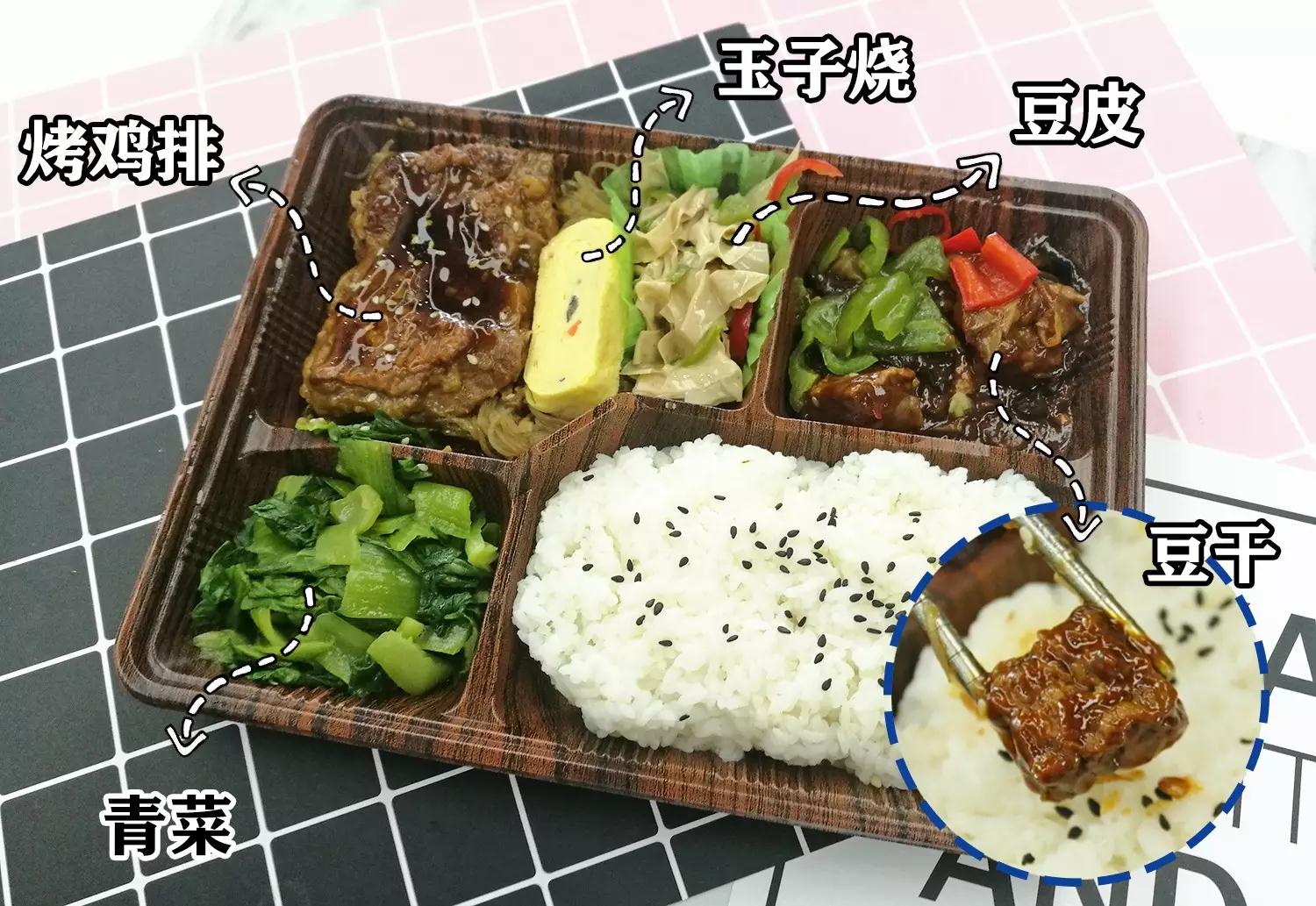 仔细查看,发现食材真的很丰富呢!除了主角一大块烤鸡排,配菜还有青菜,玉子烧,油豆皮以及红烧口味的豆干,米饭上撒上黑芝麻,看着就很有食欲!