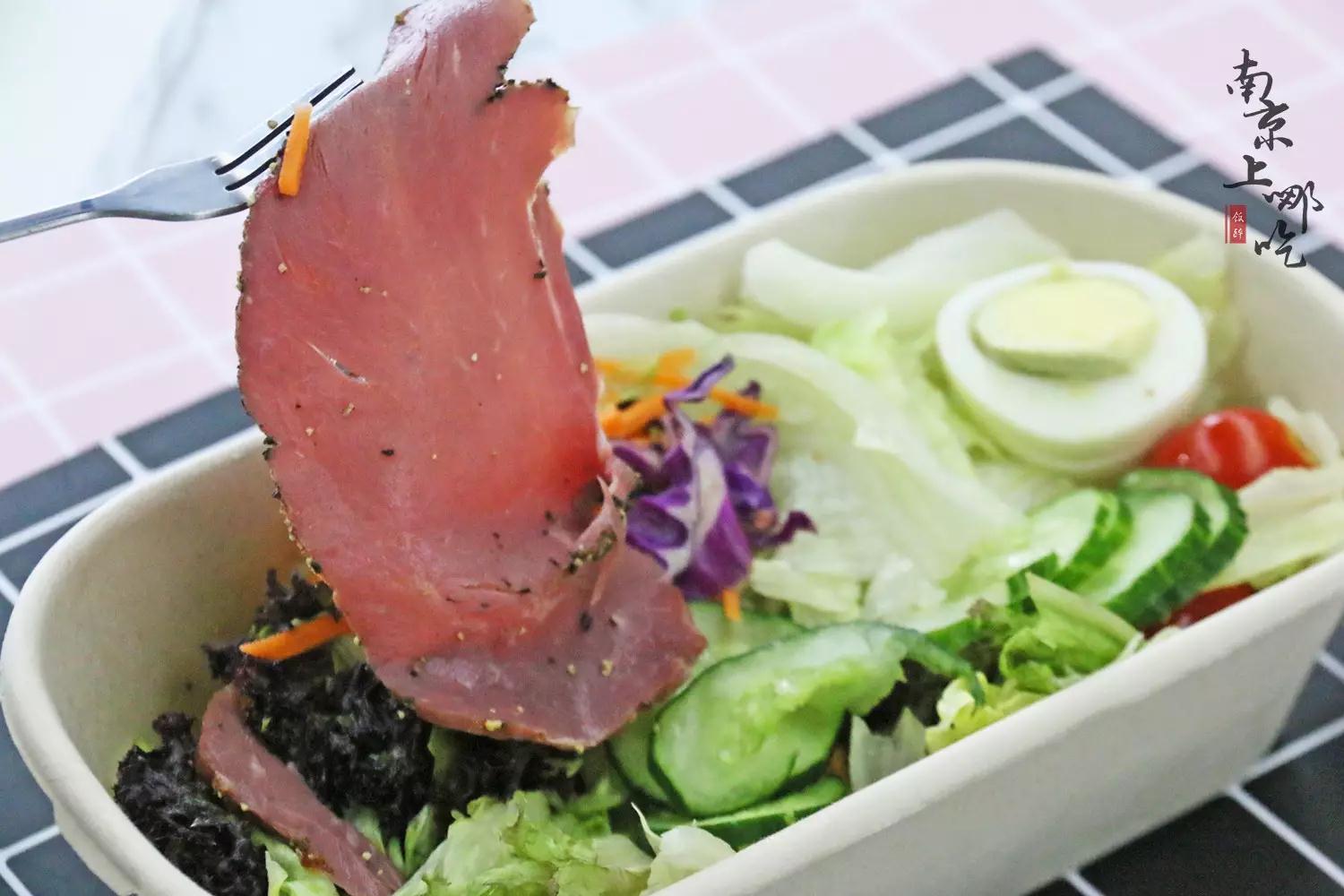 黑椒牛肉沙拉有两大片牛肉,边缘包裹着黑椒粒,嚼起来柔韧弹牙,丝丝入味,且不会很咸,搭配的沙拉酱里面加入了蛋黄酱,香浓可口,让人爱上吃草!(PS:沙拉酱热量很高,建议控制摄入量哦~)
