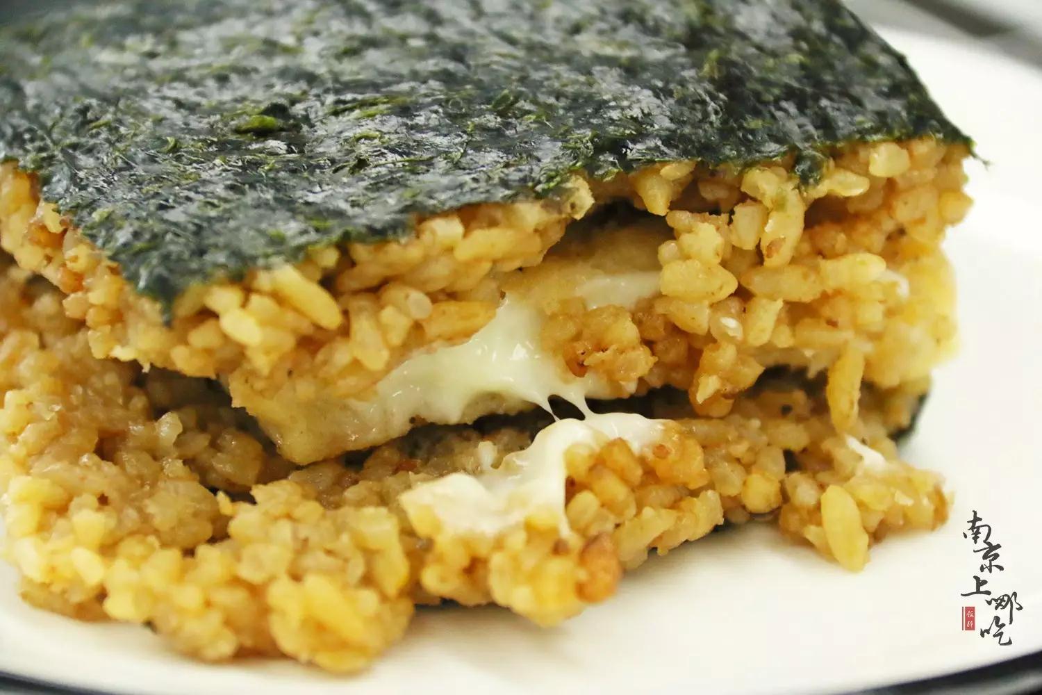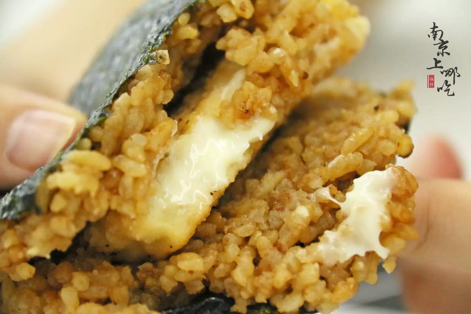 米饭紧实度和软糯程度适中,能够稳固地黏在海苔外皮上;鸡排的中间夹着一层厚厚的芝士乳酪,一直溢出到外面,在口中确实有爆浆的口感,奶香四溢。