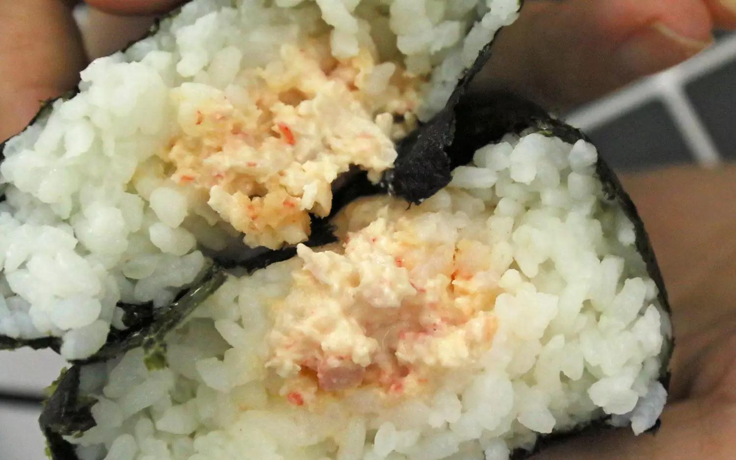 蟹肉蛋黄酱饭团的馅料相对较少,蟹肉的味道也不是很浓郁,比较平庸。