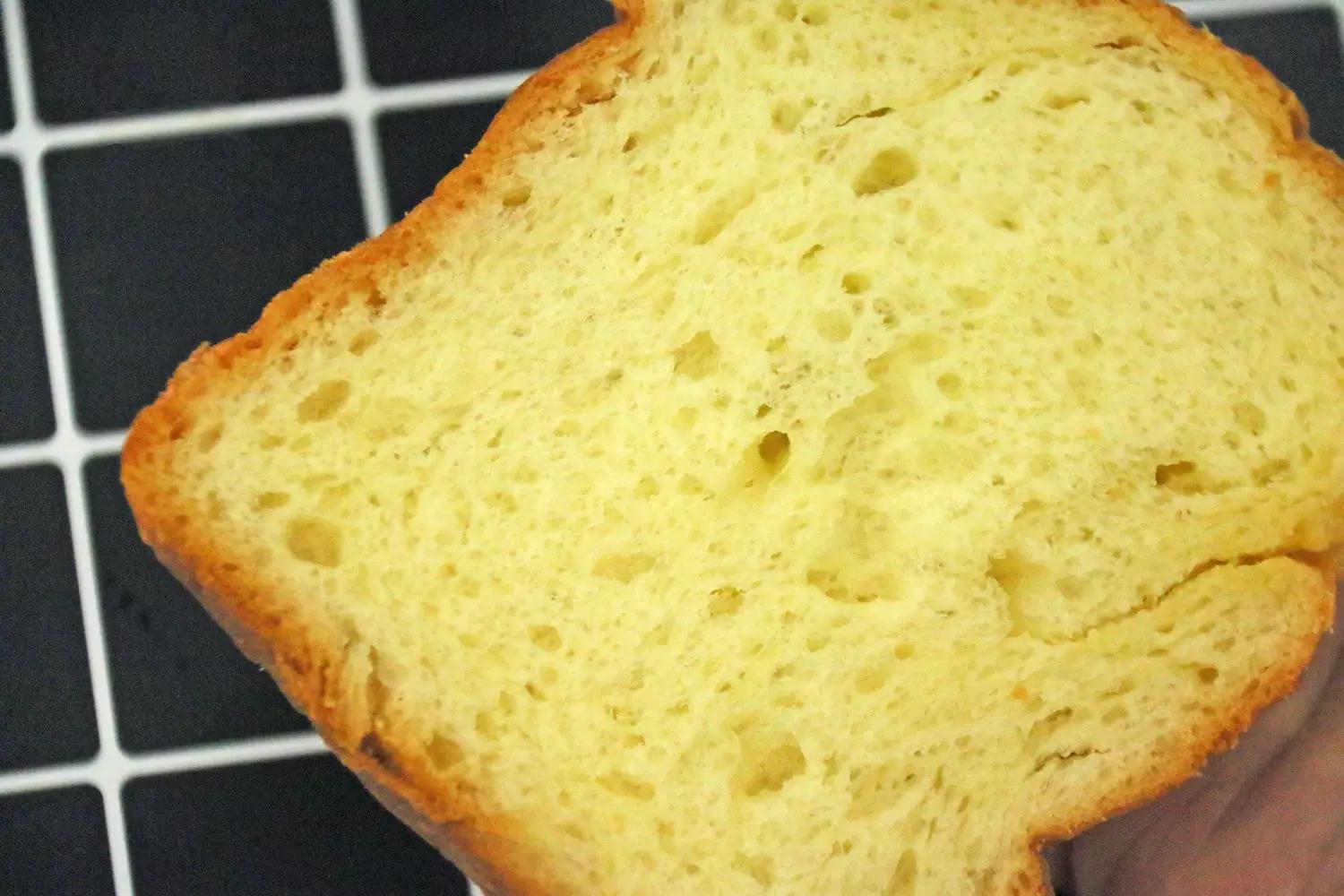 牛奶吐司颜色偏黄,应该是加了不少鸡蛋,且拿出来就发现比较油腻,奶香味很浓郁但没有想象中那么柔软,且负担感较重。
