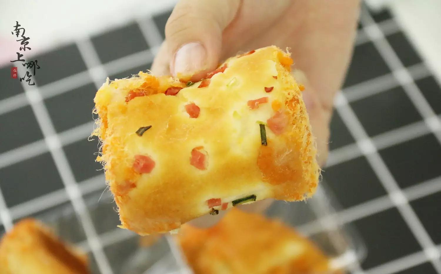 这才是真正童年的味道!缩小版的肉松面包卷!外皮一层有火腿丁和葱丝点缀,造型软萌可爱,充满童趣。