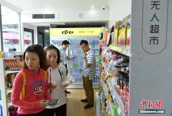 9月4日,两名女孩购物后通过扫码支付货款。当日,成都街头出现的首家无人值守、24小时营业的无人超市吸引了不少民众现场体验。据悉,年内将有10家无人超市落户成都春熙路、宽窄巷子、环球中心等商圈及景点。