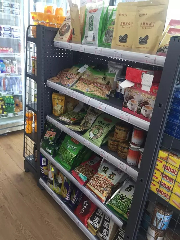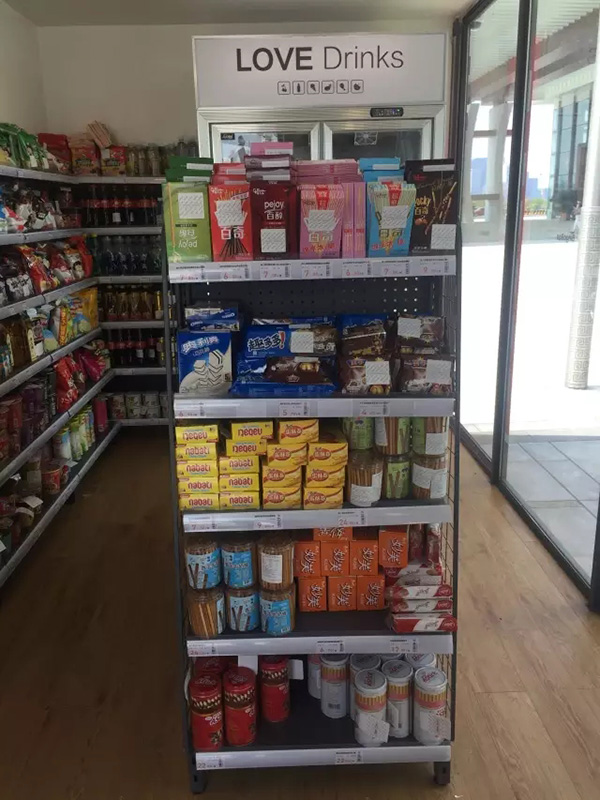 超市内只有靠墙一排L形货架,一台双门冰柜,以及中间一个小货架。货架和货架之间的通道,也只能容纳一个人通行和挑选商品,不过小虽小,商品品类倒挺全的,日用品、酒水、零食、饮料、方便食品等,基本上都有。但和普通超市不一样的是,每一件商品上,都有一个白色的方形电子标签,结款和防盗靠的就是它。