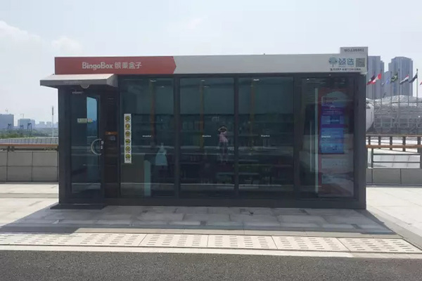 这家无人超市位于国际博览中心二楼的一个平台上,因为博览中心很大,我问了两个保安找了两圈才找到。超市很小,正如其名“缤果盒子”,就像一个占地十来平方米的长方形盒子。正面是全玻璃,可以直接看到里面货架上的商品。