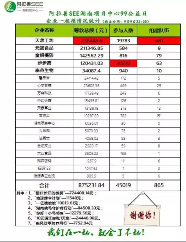 根据全国首家以保护生态为目标的环保公益机构阿拉善SEE通报,步步高集团发动了20232人参与,其总动员的捐赠人数(含9月7日前数据)名列阿拉善SEE环保项目全国第一!(9月7日—9日三天时间内,阿拉善SEE环保项目捐赠人数名列全国第二!)