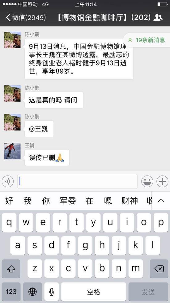 9月13日,中国金融博物馆理事长王巍发微博称,最励志的终身创业老人褚时健于9月13日逝世,但他随后删除了该条微博,并在微信群表示系误传。