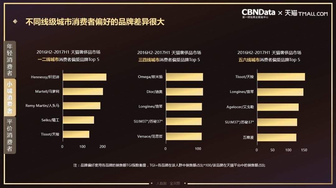 不同线级城市间消费者偏好的品牌存在很大的差异,其中,彩妆和手表是三至六线城市消费者所偏爱购买的奢侈品类。