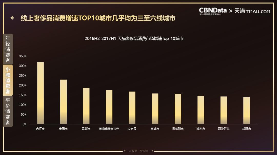 奢侈品牌通过天猫触达了更多的客群,与此同时,也让原本仅在一线城市开设线下店铺的奢侈品牌得以将商品卖给更为下沉的地区。根据CBNData《报告》显示,奢侈品市场中各线级城市消费者的件单价逐年增长,其中,三至六线城市消费者购买奢侈品的件单价在2015年已超过一二线城市消费者。与此同时,线上奢侈品消费增速TOP10城市也几乎均为三至六线城市。