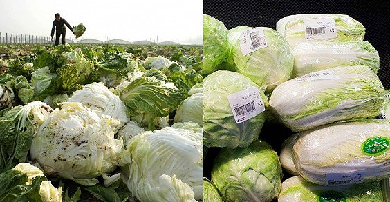 滞销白菜;右:超市高昂菜价