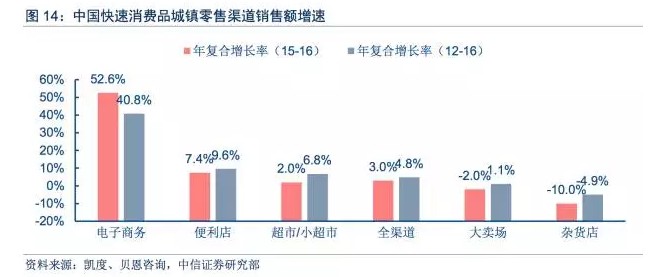 中国快速消费品城镇零售渠道销售额增速:电子商务第一,便利店第二,超市/小超市第三。图片来源:中信证券