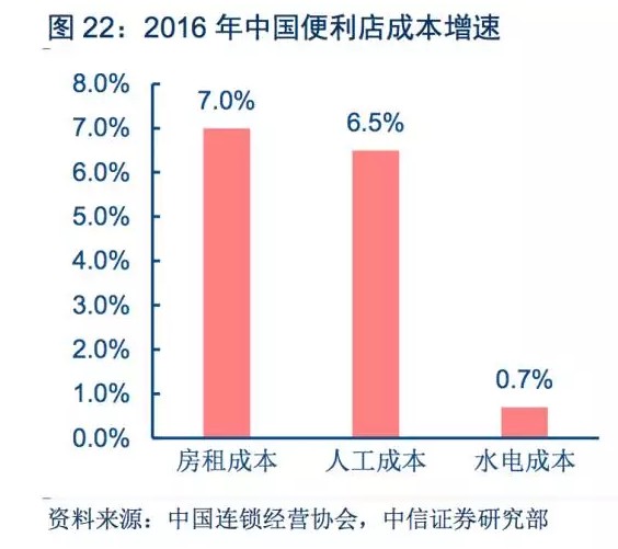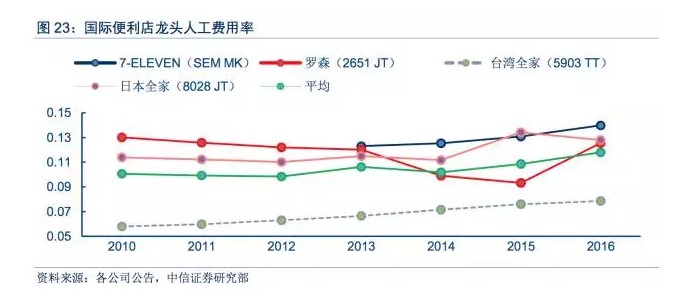 传统便利店人工及租金等经营成本不断提高,A股便利店龙头红旗连锁人工费用占销售+管理总费用近50%。红旗连锁为2016年底旗下门店2704家(自有136 家+租赁2568 家),销售+管理费用率24.2%,其中人工费用率11.2%、租金费用率 7.9%。根据中国连锁经营协会统计,2016年全国便利店租金成本上升了7.0%,人工成本上升了6.5%。在国际市场,2016年全家、罗森、7-Eleven平均人工费用率约13.9%,自2011年以来人工费用率趋势性提升。