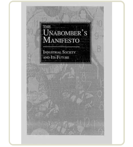 读者惊讶地发现,这居然是一篇充满思辨的哲学论文,作者明显受过学术训练。论文声称,工业革命带来的是人类的灾难,技术使人类丧失自由,最终将导致社会的动荡甚至毁灭,人们应该摧毁现代工业体系。这就是凶手为什么袭击大学教授的原因,因为他们推动了技术的发展。