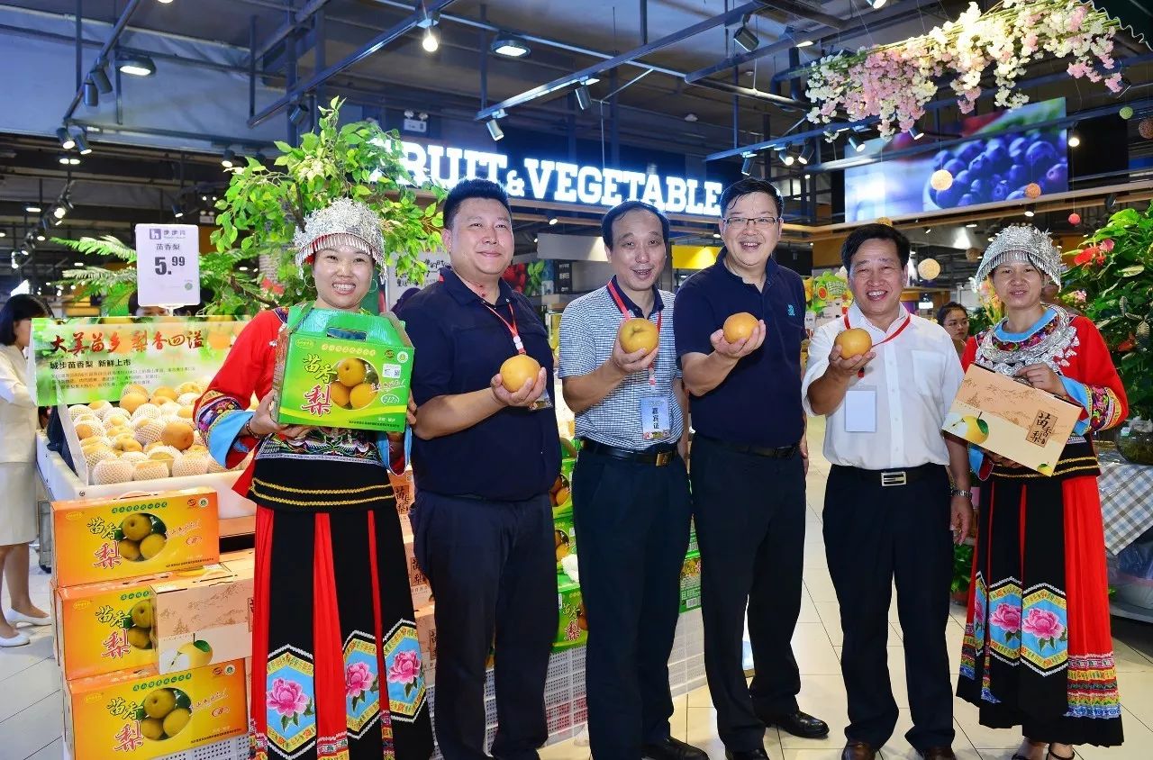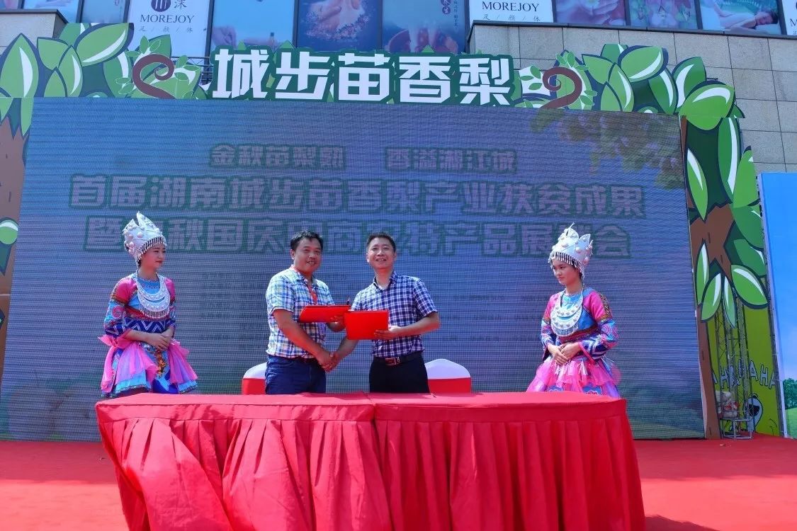2017年9月24日上午,在长沙市梅溪湖步步高梅溪新天地水秀广场,湖南省邵阳市中共城步苗族自治县委员会、城步步苗族自治县人民政府与步步高集团联合举办了一场别开生面的“金秋苗梨熟,香溢湘江城——首届湖南城步苗香梨产业扶贫成果暨中秋国庆电商农特产品展销会”。