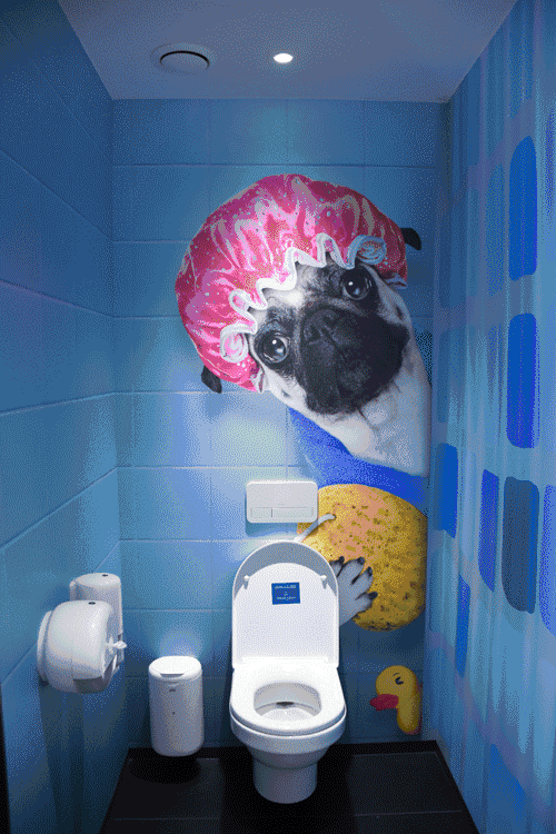 还有蠢萌蠢萌的狗狗、高级线条感的性冷淡风的WC、蛋糕烟花的少女心WC、还有披着“小树林”外衣的WC!推开这里每个WC单间的门,你都会偶遇一个完全不同的主题。
