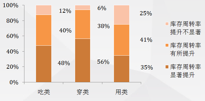 在吃穿用三大类产品中,网络零售对提升穿类产品库存周转率效果最明显,高达94%的服装企业认为网络零售提高了其库存周转率。