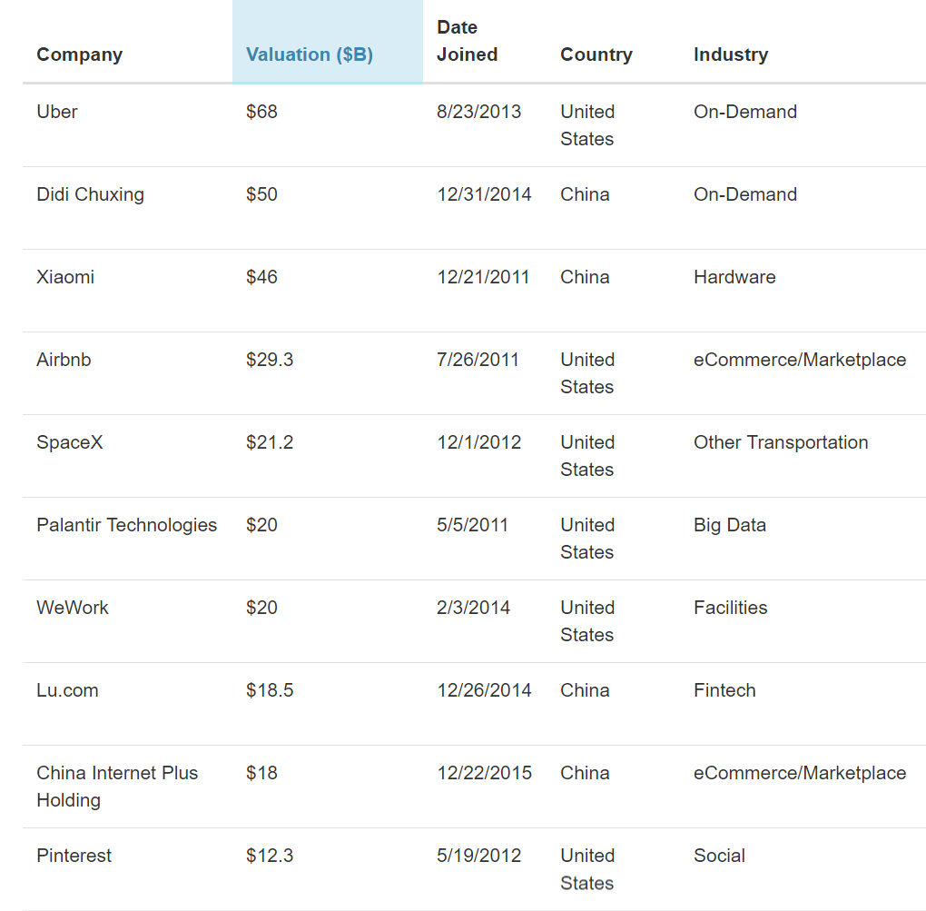 美国著名创投研究机构CBInsights近日发布“全球独角兽公司榜单”,共计214家企业上榜。前十名中,有6家为美国企业,其余4家皆为中国企业,分别是滴滴出行、小米、陆金所和新美大。
