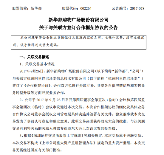 龙商网消息:北京时间9月26日晚,新华都在深交所公告称,与阿里巴巴集团旗下的杭州阿里巴巴泽泰签订合作框架协议,拟进行资源互补,共享各自供应链优势和零售业务转型升级等方面开展业务合作。