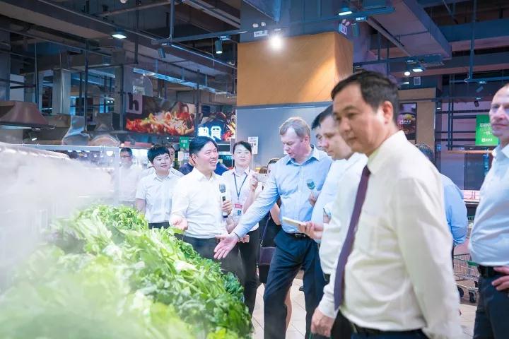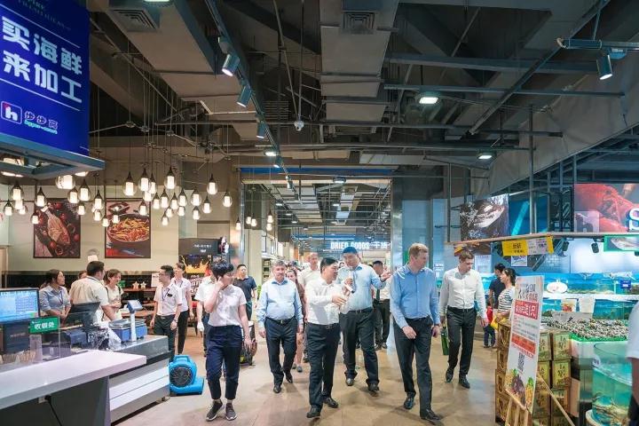 位于梅溪新天地B1层的步步高超市已经提前进入国庆模式,人气盎然。王填董事长自豪地向多马涅夫斯基主席一行介绍了步步高的第三代大卖场,近年来,国外零售业巨头大举进军中国加剧了零售业的竞争,但中国本土零售企业是遇强则更强。正如华为突破重重困难扛起中国品牌大旗,中国企业已越来越强。在海鲜区域,一边是装有鲜活的波士顿龙虾、帝王蟹、面包蟹水箱,另一边就是厨师烹饪现场,考察团对这种超市里的餐饮模式无不赞叹。