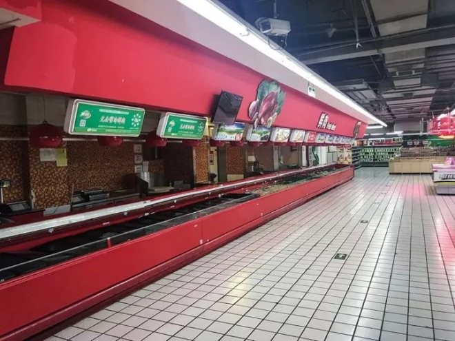 这座面积巨大的卖场显然并非一直如此冷清,多达18条的结账通道似乎还在诉说着往日的热闹景象。如今,整座超市里只能见到约10名员工,结账通道只开了两条,而且还严重“开工不足”:顾客也并没有比员工多多少。他们有的似乎是有备而来,推车里装满了一箱箱清仓甩卖的日用品,有的则看着空荡荡的货架发呆,不时露出困惑的神情。“这超市快关门了吧?”面对顾客的询问,收银员们始终面无表情,沉默不语。