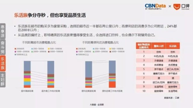 相比职场新人,多为职场精英的乐活族们工作生活平衡,工作日高度依赖便利店,周末更爱逛超市;从品类的偏好上,作为职场精英的乐活族更懂得享受生活,会选择进口饮料,也会偶尔下厨犒劳自己。