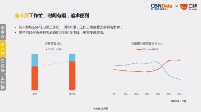23-27岁的一二线城市单身白领是奋斗党的主要人群。他们初入职场,工作忙,时间有限,以至于工作日更偏爱去便利店消费;而到了周末,则更享受去超市集中采购,单笔花费是平时在便利店购买的三倍多;同时,在便利店使用优惠券的人数占比要略高于超市。