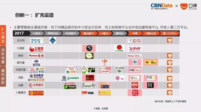 这对于仍占有份额优势的传统大卖场而言,既是威胁,亦是转型的方向。根据CBNData《报告》显示,大卖场零售巨头们新开门店相比以往均更偏向于社区零售业态。与此同时,精品超市迅速扩张,传统零售商2017上半年新开门店中近一半都为精品超市。