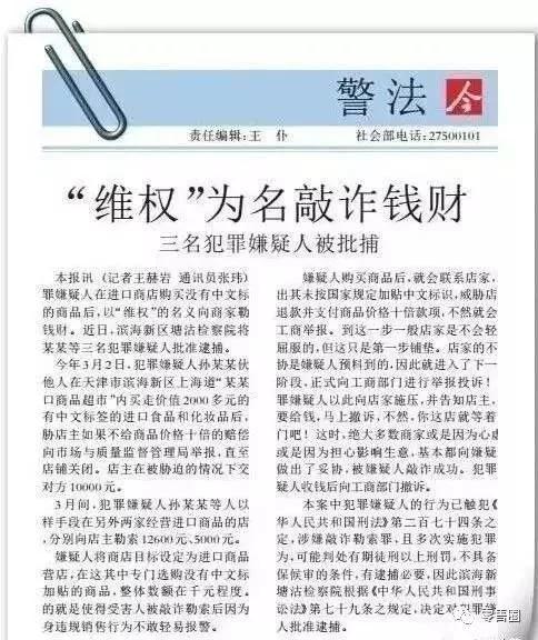 职业打假 犯罪嫌疑人在进口商店购买没有中文标签的商品后,以“维权”的名义向商家勒索钱财。近日,天津滨海新区塘沽检察院将孙某某等三名犯罪嫌疑人批准逮捕。