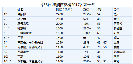 3位企业家新进入前十,分别是财富达去年3倍多的碧桂园36岁的杨惠妍、“快递大王”顺丰王卫和财富几乎是去年4倍的吉利李书福、李星星父子。