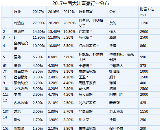 制造业上榜人数占比仍然最高,达27.9%,先进制造,以美的和蓝思科技(27.950, -0.44,-1.55%)为主,上升很多;房地产人数占比持续下降,但仍以14.6%排第二,房地产行业财富总额是上涨的;IT和金融投资行业略有上升,分别位列三四;再次是医药行业,位列第五。新美大(原美团大众点评)、饿了么以及共享经济的代表ofo和摩拜所在的社会服务行业今年上升最快。其他表现较好的还有教育、新零售、汽车和食品行业。新能源和传统零售表现不佳。胡润表示:“制造业绝对是中国企业家的第一大行业,有3成都靠这个上榜,其次是房地产,只有制造业的一半。”