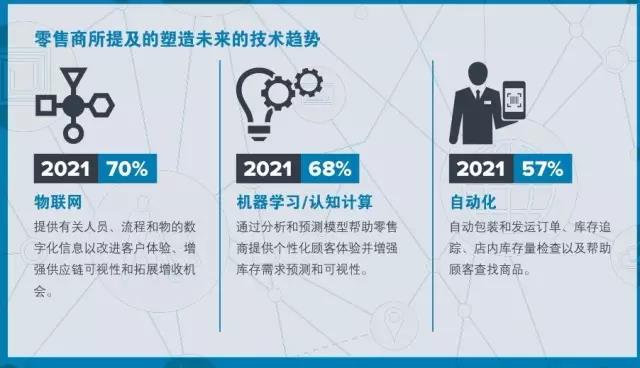 消费者的预期在不断变化,技术也在不断进步,全球零售业都处在转型中,物联网、机器学习/认知计算和自动化是全球零售商最关心的技术趋势。