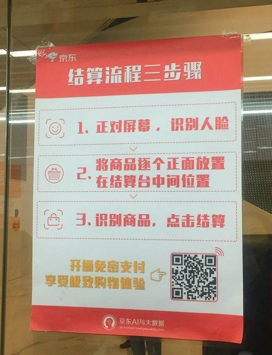 京东给每个货架上都装有智能传感器和人脸识别摄像头。智能传感器设于货架底部,用户在货架前拿走商品后,会触发智能感应器及人脸识别摄像头,实现人货绑定。