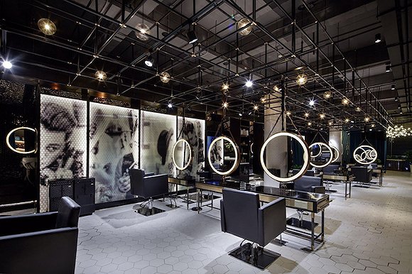 理发店如果只追求干净、整洁,很难给人留下印象。无锡一家理发店,就以奢华酒吧为灵感,把空间主色调定位黑色,在镜子上装上了灯管,用了各种造型奇特的灯具,通过墙面印花,家具选择,来把空间填满。