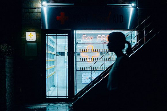 整家店通体白色,冷光的日光灯使得整个空间泛着青光,显得清冷异常。好在门店收银台背景墙上的橘色十字架霓虹灯,以及摆在货架上盛装药片的橘色药瓶子,为整个空间添了一些暖色。