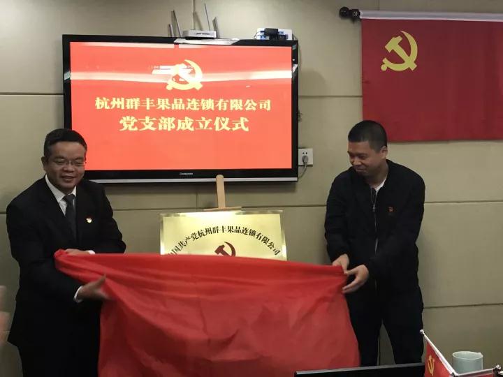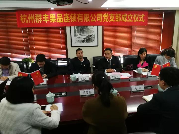2017年10月18日上午10时,杭州群丰果品连锁有限公司党支部(以下称“鲜丰水果党支部”)成立了。区委组织部部务会议成员、区委两新工委副书记金成武,和睦街道党工委书记饶文玖、党工委副书记陶文龙、党工委委员周茜、詹丽萍和公司代表周月雅家人、党支部全体党员参加仪式,和睦街道党工委副书记陶文龙主持会议。
